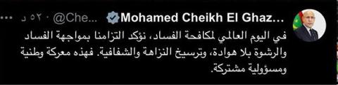 جاء ذلك في تغريدة على صفحته في منصة إكس بمناسبة اليوم العالمي لمكافحة الفساد.
