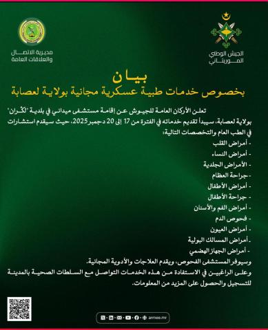 أعلن الجيش الوطني الموريتاني عن إقامة مستشفى ميداني في بلدية لكران بولاية العصابة مؤكدا أنه سيبدأ تقديم خدمات طبية في الفترة مابين 17 إلى 20 دجمبر الجاري.
