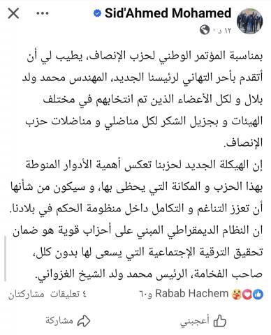 واعتبر ولد محمد في تدوينة نشرها أن الهيكلة الجديد للحزب "تعكس أهمية الأدوار المنوطة به والمكانة التي يحظى بها".