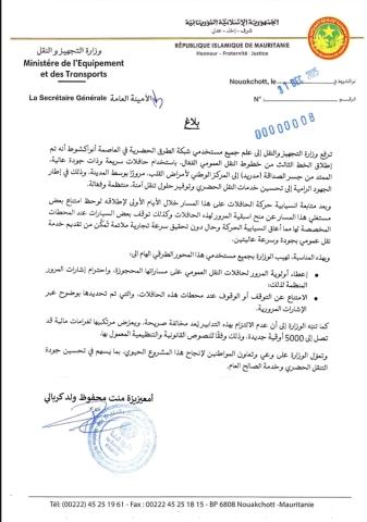 ودعت الوزارة جميع مستخدمي هذا المحور الطرقي إلى احترام أولوية مرور حافلات النقل العمومي والامتناع عن التوقف عند محطاتها، منبهة إلى أن مخالفة هذه الإجراءات تُعد خرقًا للقوانين المعمول بها وتعرّض مرتكبيها لغرامات مالية قد تصل إلى 5000 أوقية جديدة.