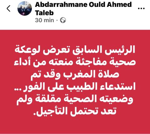 قال المحامي عبد الرحمن ولد زروق إن موكله الرئيس السابق محمد ولد عبد العزيز، تعرض لوعكة صحية مفاجئة، مساء أمس الاثنين، منعته من أداء صلاة المغرب.
