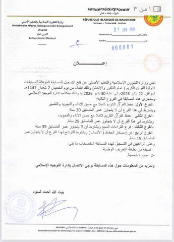 أعلنت وزارة الشؤون الإسلامية والتعليم الأصلي عن فتح باب التسجيل للمسابقة المؤهلة للمسابقات الدولية في القرآن الكريم .