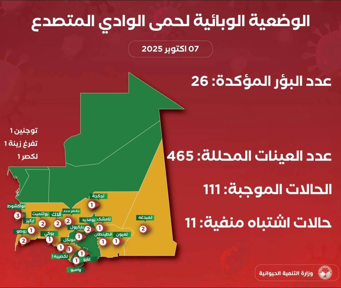 أرجع وزير التنمية الحيوانية، سيد أحمد ولد محمد، سبب انتشار حمى الوادي المتصدع في البلاد إلى ارتفاع منسوب الأمطار هذا العام ، مما ساهم في كثرة الباعوض الذي ينقل الفيروس المسبب للإصابة بالمرض بين الح