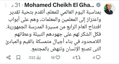 تقدم الرئيس محمد ولد الشيخ الغزواني بتحية تقدير واعتزاز إلى المعلمين والمعلمات، بمناسبة اليوم العالمي للمعلم.