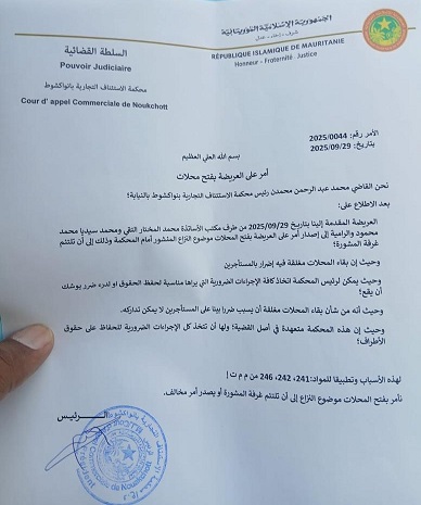 أمر رئيس محكمة الاستئناف التجارية بنواكشوط بالنيابة القاضي محمد عبد الرحمن محمدن بفتح محلات تجارية موضوع نزاع في سوق السبخة المركزي.