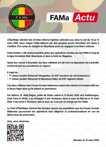 قالت هيئة الأركان العامة للقوات المسلحة المالية إن عنصرين من عناصرها كانا محتجزين لدى جماعات إرهابية مسلحة تمكنا من الفرار من مخيم للاجئين في موريتانيا.