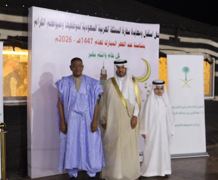 أقام سعادة السفير السعودي بموريتانيا، الدكتور عبدالعزيز بن عبدالله الرقابي، مساء الجمعة 20 مارس 2026، ليل السبت، في مقر السفارة، حفل معايدة ، بمناسبة عيد الفطر المبارك، على شرف موظفي البعثة السعودية والسعوديين المقيمين في الجمهورية الاسلامية الموريتانية وسفراء الدول العربية والإسلامية المعتمدين في نواكشوط، بحضور وزيرا الشؤون الإسلامية والثقافة ومفتي الجمهورية، وشخصيات رسمية موريتانية ونخبة من ممثلي المجتمع المدني الموريتاني وعدد من الإعلاميين وقادة الرأي، حيث تناول المدعوون القهوة السعودية والعشاء.