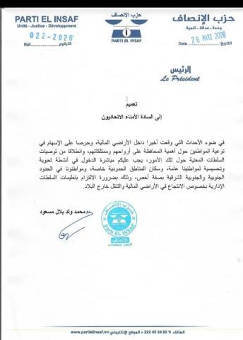 طالب حزب الإنصاف أمناء اتحادياته إلى التعبئة والتحسيس وحث المواطنين على الالتزام بتعليمات السلطات بخصوص منع الانتجاع داخل أراضي مالي.